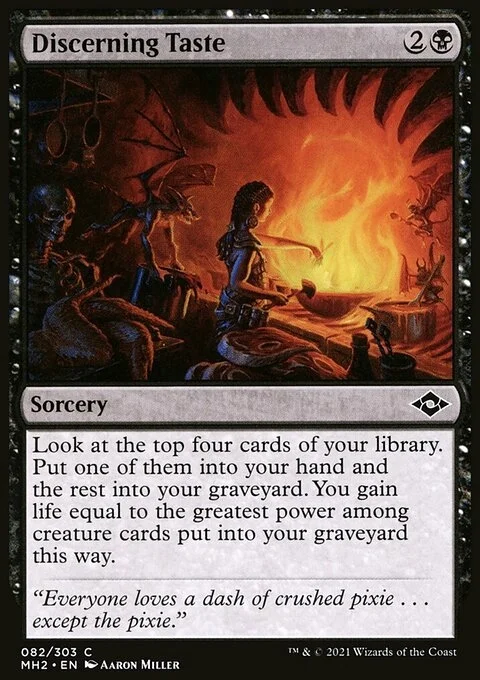 Look at the top four cards of your library. Put one of them into your hand and the rest into your graveyard. You gain life equal to the greatest power among creature cards put into your graveyard this way.