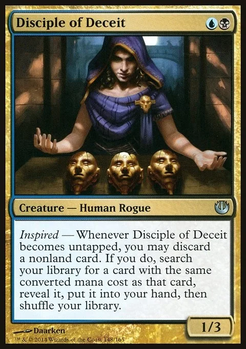 Inspired — Whenever Disciple of Deceit becomes untapped, you may discard a nonland card. If you do, search your library for a card with the same converted mana cost as that card, reveal it, put it into your hand, then shuffle your library.