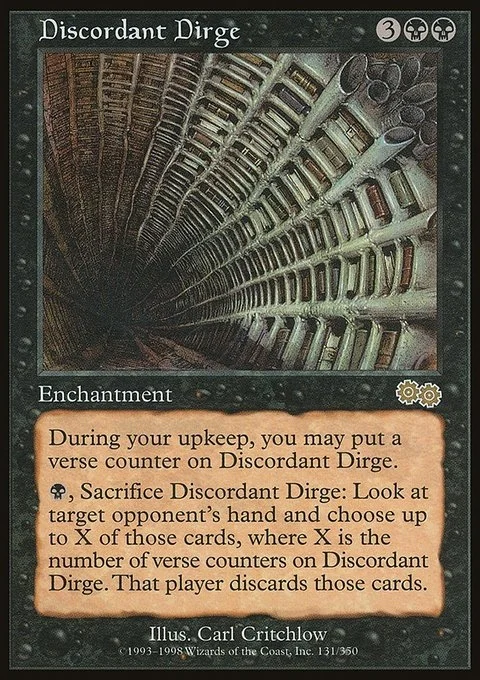 During your upkeep, you may put a verse counter on Discordant Dirge.B, Sacrifice Discordant Dirge: Look at target opponent’s hand and choose up to X of those cards, where X is the number of verse counters on Discordant Dirge. That player discards those cards.