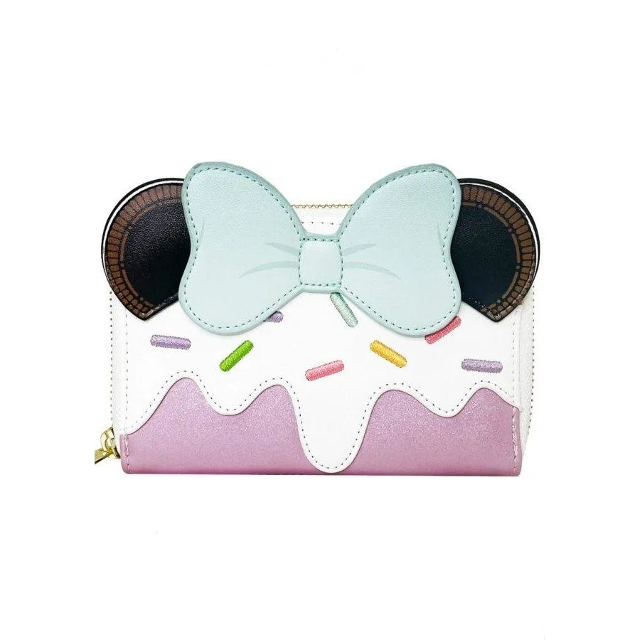 This original design is inspired by Minnie and ice cream cones! Enjoy a scoop of pastel ice cream topped off with whipped cream applique and embroidered sprinkles, and finished with a glaze of shimmery sparkles for that frosted look. On the back, a sugar cone lined with embroidery completes this delectable collectible. With chocolate sandwich Minnie ears and a mint pastel bow, this is the perfect treat for Disney collectors, dessert lovers or a Loungefly sweet tooth!