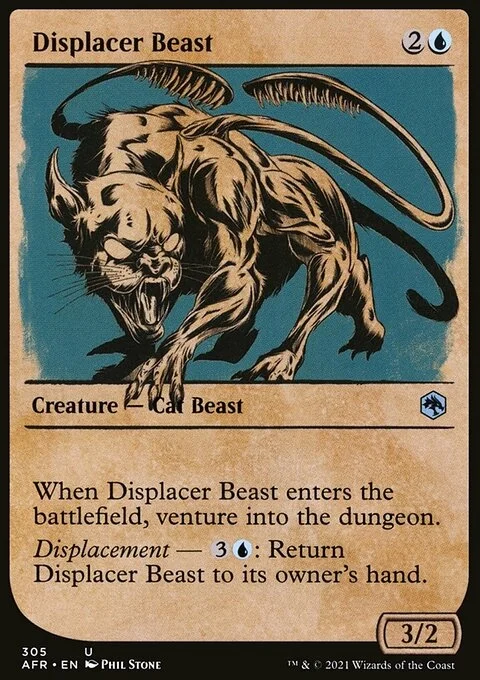 When Displacer Beast enters the battlefield, venture into the dungeon. (Enter the first room or advance to the next room.) Displacement — {3}{U}: Return Displacer Beast to its owner's hand.