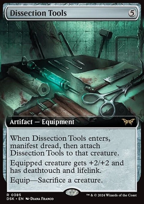When Dissection Tools enters, manifest dread, then attach Dissection Tools to that creature. Equipped creature gets +2/+2 and has deathtouch and lifelink. Equip—Sacrifice a creature.