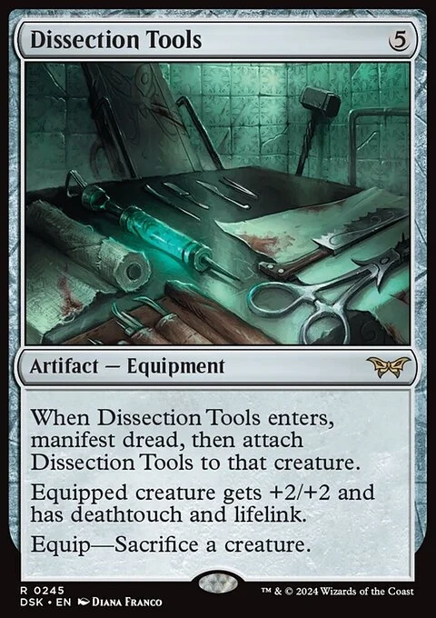 When this Equipment enters, manifest dread, then attach this Equipment to that creature. Equipped creature gets +2/+2 and has deathtouch and lifelink. Equip—Sacrifice a creature.