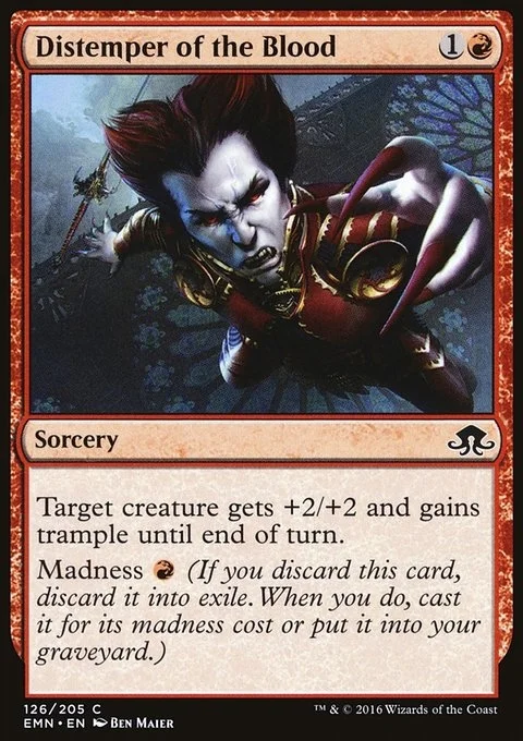 Target creature gets +2/+2 and gains trample until end of turn. Madness {R} (If you discard this card, discard it into exile. When you do, cast it for its madness cost or put it into your graveyard.)