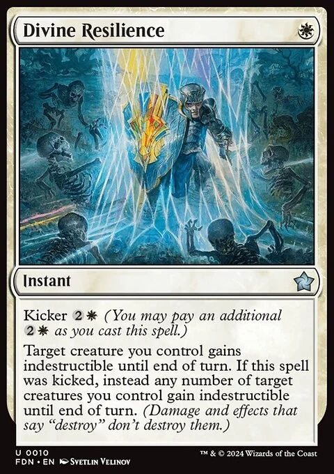 Kicker {2}{W} (You may pay an additional {2}{W} as you cast this spell.) Target creature you control gains indestructible until end of turn. If this spell was kicked, instead any number of target creatures you control gain indestructible until end of turn. (Damage and effects that say "destroy" don't destroy them.)