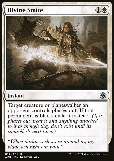 Target creature or planeswalker an opponent controls phases out. If that permanent is black, exile it instead. (If it phases out, treat it and anything attached to it as though they don't exist until its controller's next turn.)
