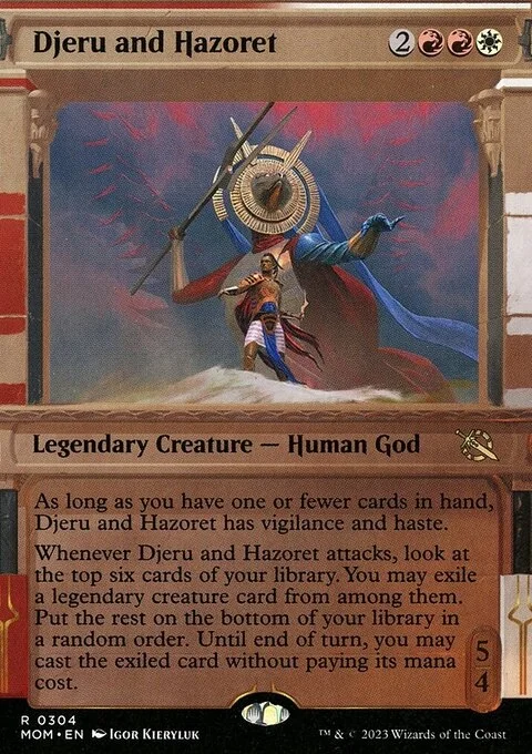 As long as you have one or fewer cards in hand, Djeru and Hazoret has vigilance and haste. Whenever Djeru and Hazoret attacks, look at the top six cards of your library. You may exile a legendary creature card from among them. Put the rest on the bottom of your library in a random order. Until end of turn, you may cast the exiled card without paying its mana cost.