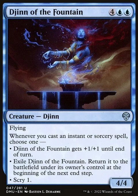 Flying Whenever you cast an instant or sorcery spell, choose one — • Djinn of the Fountain gets +1/+1 until end of turn. • Exile Djinn of the Fountain. Return it to the battlefield under its owner's control at the beginning of the next end step. • Scry 1.