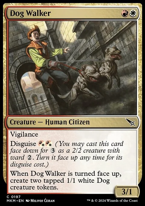 Vigilance Disguise {R/W}{R/W} (You may cast this card face down for {3} as a 2/2 creature with ward {2}. Turn it face up any time for its disguise cost.) When this creature is turned face up, create two tapped 1/1 white Dog creature tokens.
