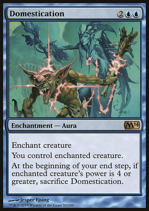 Enchant creature You control enchanted creature. At the beginning of your end step, if enchanted creature's power is 4 or greater, sacrifice Domestication.