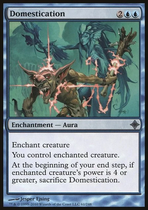 Enchant creature You control enchanted creature. At the beginning of your end step, if enchanted creature's power is 4 or greater, sacrifice Domestication.