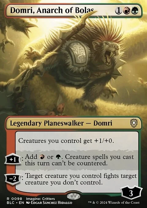 Creatures you control get +1/+0. +1: Add {R} or {G}. Creature spells you cast this turn can't be countered. -2: Target creature you control fights target creature you don't control.