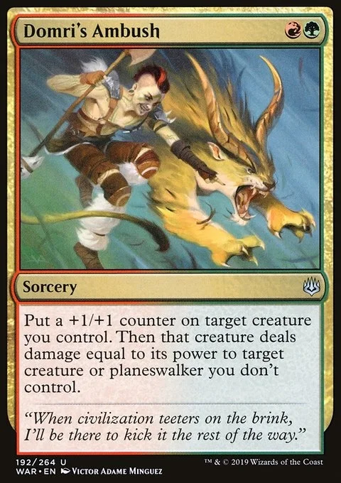 Put a +1/+1 counter on target creature you control. Then that creature deals damage equal to its power to target creature or planeswalker you don't control.