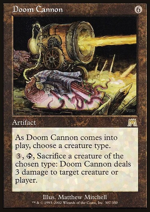 As Doom Cannon enters the battlefield, choose a creature type. {3}, {T}, Sacrifice a creature of the chosen type: Doom Cannon deals 3 damage to any target.