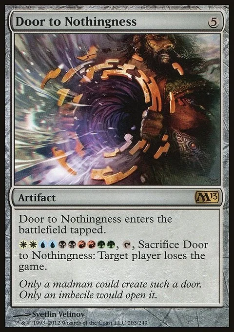 Door to Nothingness enters the battlefield tapped. {W}{W}{U}{U}{B}{B}{R}{R}{G}{G}, {T}, Sacrifice Door to Nothingness: Target player loses the game.