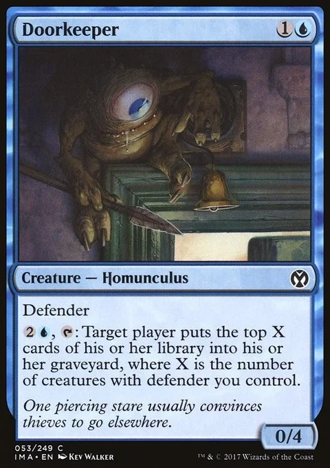Defender {2}{U}, {T}: Target player mills X cards, where X is the number of creatures you control with defender.