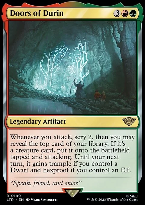 Whenever you attack, scry 2, then you may reveal the top card of your library. If it's a creature card, put it onto the battlefield tapped and attacking. Until your next turn, it gains trample if you control a Dwarf and hexproof if you control an Elf.