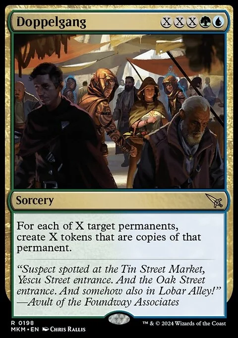 For each of X target permanents, create X tokens that are copies of that permanent.