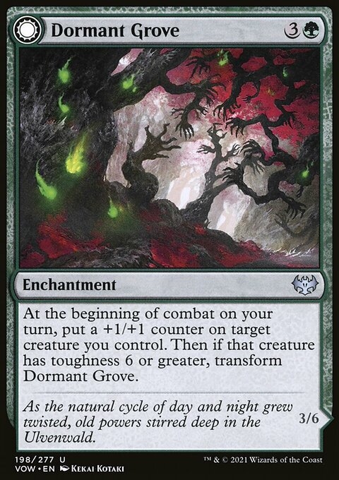 At the beginning of combat on your turn, put a +1/+1 counter on target creature you control. Then if that creature has toughness 6 or greater, transform Dormant Grove.