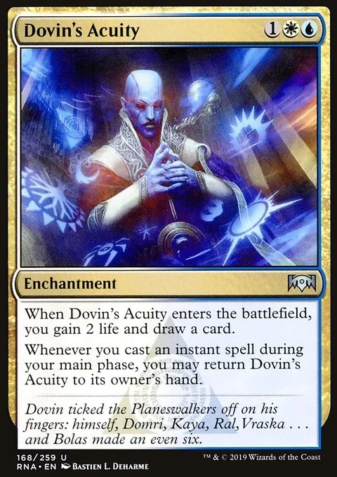 When Dovin's Acuity enters the battlefield, you gain 2 life and draw a card. Whenever you cast an instant spell during your main phase, you may return Dovin's Acuity to its owner's hand.
