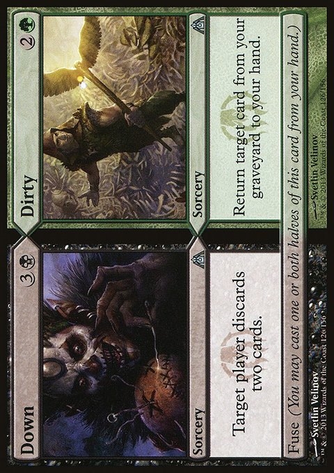 Down Target player discards two cards. Fuse (You may cast one or both halves of this card from your hand.) Dirty Return target card from your graveyard to your hand. Fuse (You may cast one or both halves of this card from your hand.)