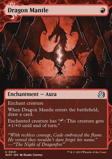 Enchant creature When Dragon Mantle enters the battlefield, draw a card. Enchanted creature has "{R}: This creature gets +1/+0 until end of turn."