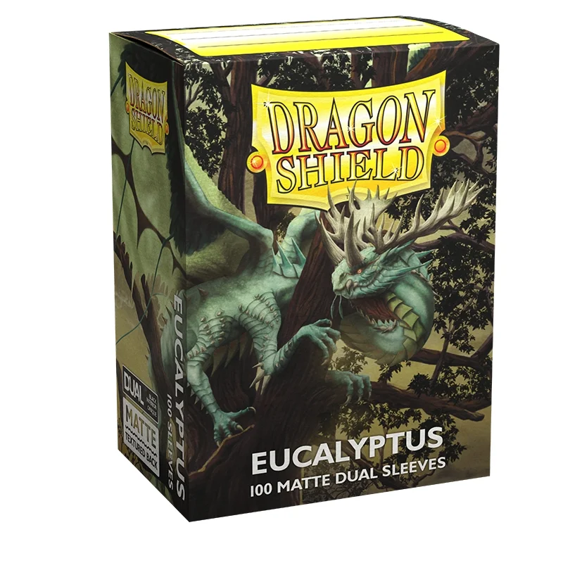 Dragon Shield Dual Matte sleeves. Clear front and a textured matte back. Fully opaque sleeves with a black interior, an elegant backdrop for black bordered cards. The sturdy cardboard box fits 75+ single sleeved cards or 65+ double sleeved cards. Every box has a label on the top for personalization.