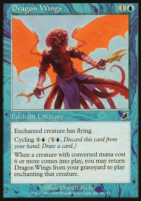 Enchant creature Enchanted creature has flying. Cycling {1}{U} ({1}{U}, Discard this card: Draw a card.) When a creature with mana value 6 or greater enters, you may return Dragon Wings from your graveyard to the battlefield attached to that creature.