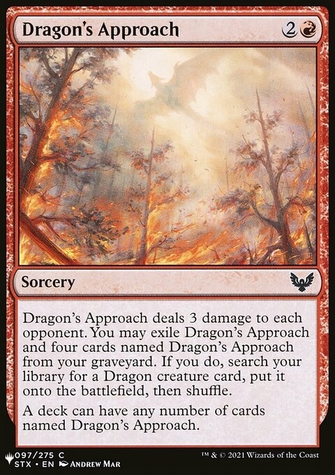 Dragon's Approach deals 3 damage to each opponent. You may exile Dragon's Approach and four cards named Dragon's Approach from your graveyard. If you do, search your library for a Dragon creature card, put it onto the battlefield, then shuffle.