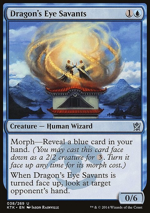 Morph—Reveal a blue card in your hand. (You may cast this card face down as a 2/2 creature for {3}. Turn it face up any time for its morph cost.) When Dragon's Eye Savants is turned face up, look at target opponent's hand.