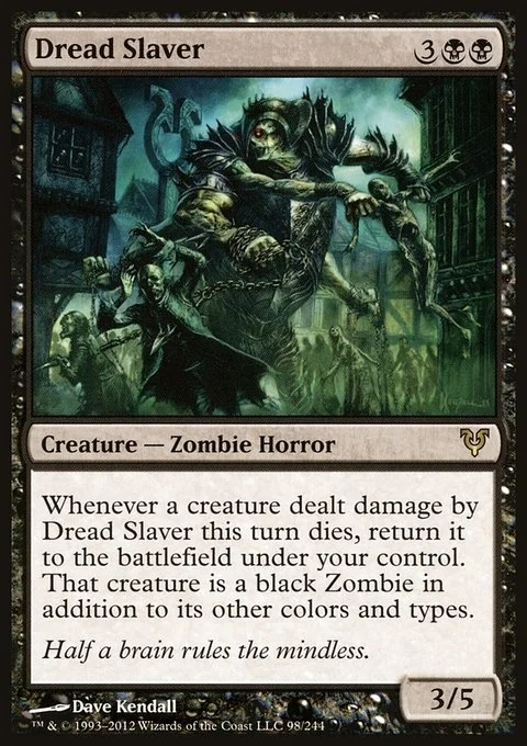 Whenever a creature dealt damage by Dread Slaver this turn dies, return it to the battlefield under your control. That creature is a black Zombie in addition to its other colors and types.
