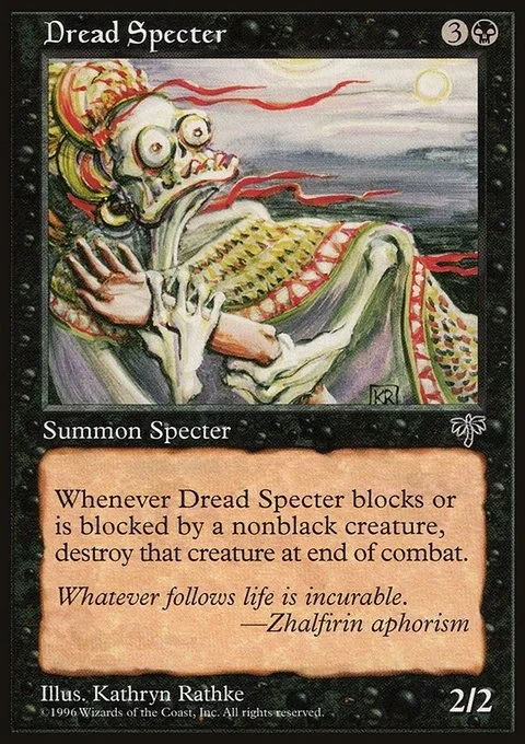 Whenever Dread Specter blocks or is blocked by a nonblack creature, destroy that creature at end of combat.