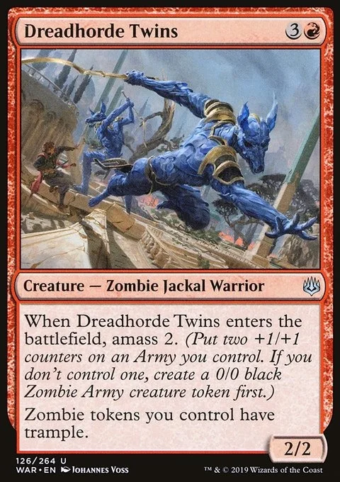When Dreadhorde Twins enters the battlefield, amass Zombies 2. (Put two +1/+1 counters on an Army you control. It's also a Zombie. If you don't control an Army, create a 0/0 black Zombie Army creature token first.)