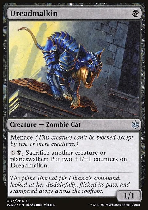 Menace (This creature can't be blocked except by two or more creatures.) {2}{B}, Sacrifice another creature or planeswalker: Put two +1/+1 counters on Dreadmalkin.
