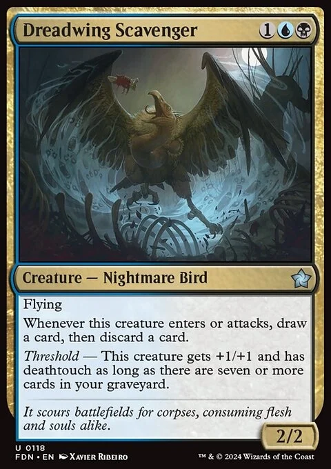 Flying Whenever this creature enters or attacks, draw a card, then discard a card. Threshold — This creature gets +1/+1 and has deathtouch as long as there are seven or more cards in your graveyard.