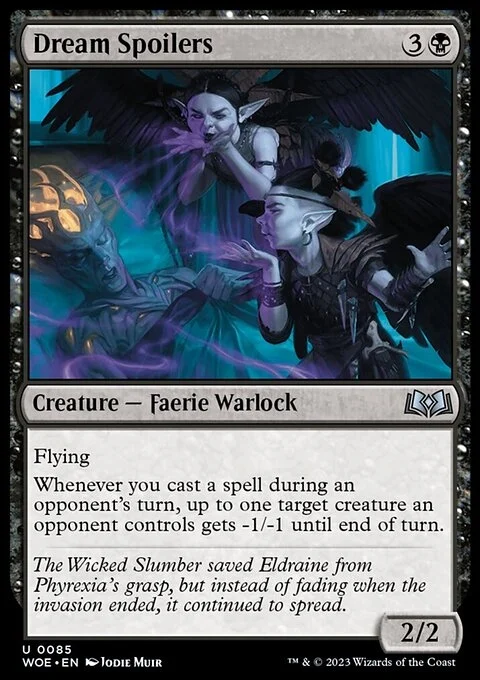 Flying Whenever you cast a spell during an opponent's turn, up to one target creature an opponent controls gets -1/-1 until end of turn.