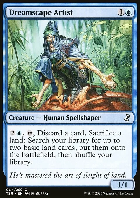 {2}{U}, {T}, Discard a card, Sacrifice a land: Search your library for up to two basic land cards, put them onto the battlefield, then shuffle.