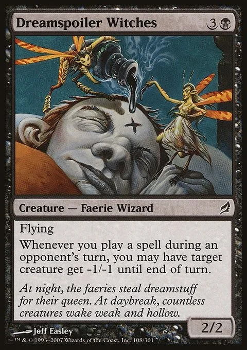 Flying Whenever you cast a spell during an opponent's turn, you may have target creature get -1/-1 until end of turn.