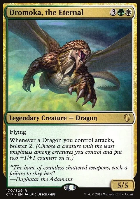 Flying Whenever a Dragon you control attacks, bolster 2. (Choose a creature with the least toughness among creatures you control and put two +1/+1 counters on it.)