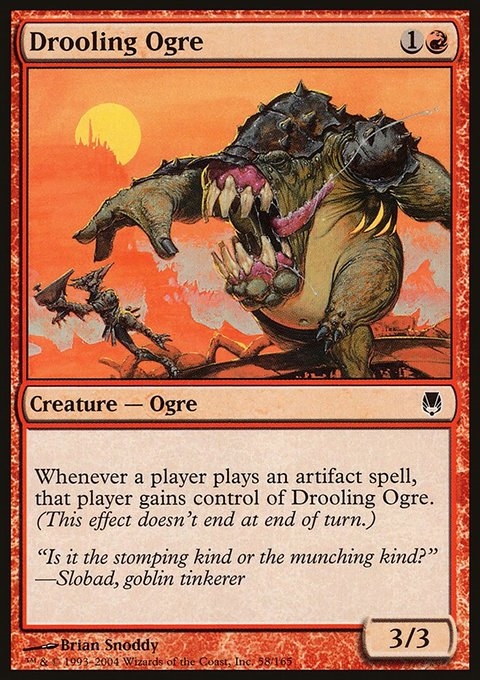 Whenever a player casts an artifact spell, that player gains control of Drooling Ogre. (This effect lasts indefinitely.)