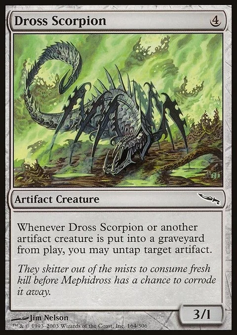 Whenever Dross Scorpion or another artifact creature dies, you may untap target artifact.