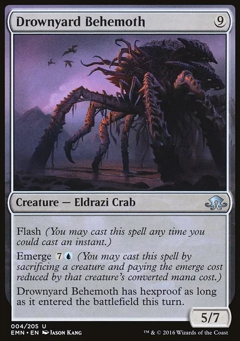 Flash (You may cast this spell any time you could cast an instant.) Emerge {7}{U} (You may cast this spell by sacrificing a creature and paying the emerge cost reduced by that creature's mana value.) Drownyard Behemoth has hexproof as long as it entered the battlefield this turn.
