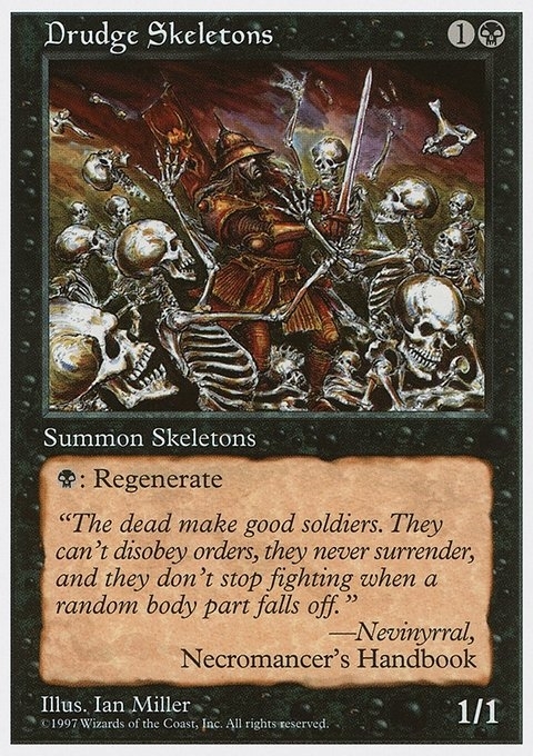{B}: Regenerate Drudge Skeletons. (The next time this creature would be destroyed this turn, it isn't. Instead tap it, remove all damage from it, and remove it from combat.)