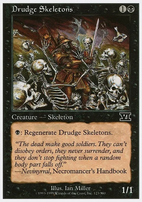 {B}: Regenerate Drudge Skeletons. (The next time this creature would be destroyed this turn, it isn't. Instead tap it, remove all damage from it, and remove it from combat.)
