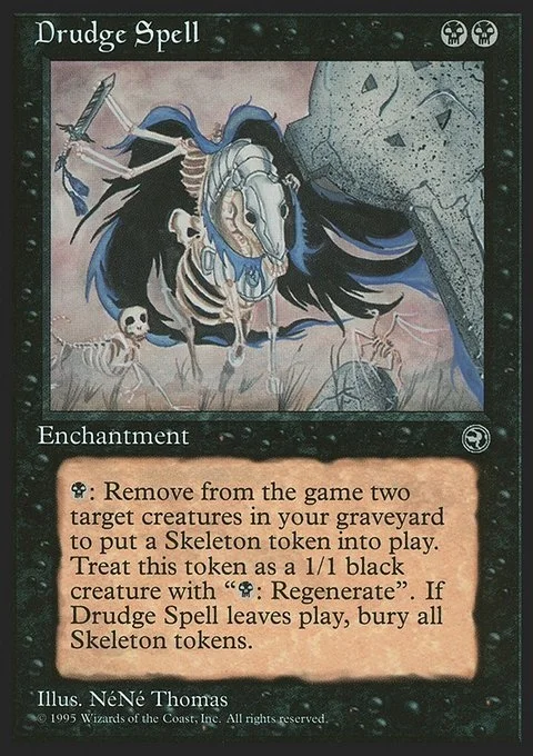 B: Remove from the game two target creatures in your graveyard to put a Skeleton token into play. Treat this token as a 1/1 black creature with "B: Regenerate". If Drudge Spell leaves play, bury all Skeleton tokens.
