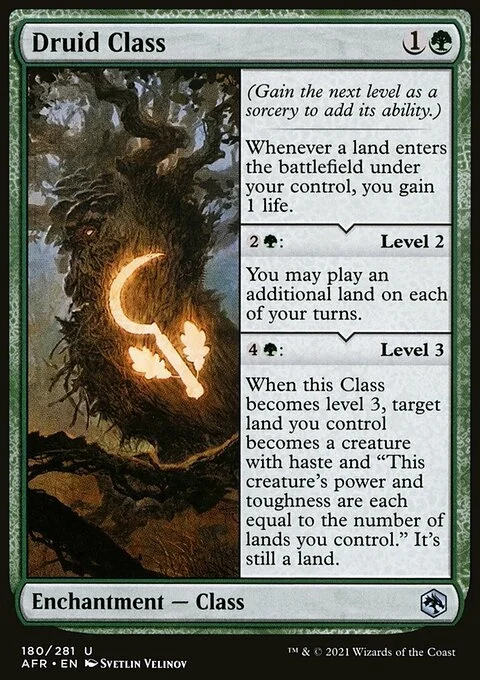 (Gain the next level as a sorcery to add its ability.) Landfall — Whenever a land enters the battlefield under your control, you gain 1 life. {2}{G}: Level 2 You may play an additional land on each of your turns. {4}{G}: Level 3 When this Class becomes level 3, target land you control becomes a creature with haste and "This creature's power and toughness are each equal to the number of lands you control." It's still a land.