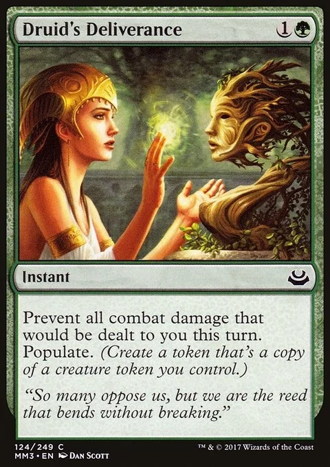 Prevent all combat damage that would be dealt to you this turn. Populate. (Create a token that's a copy of a creature token you control.)