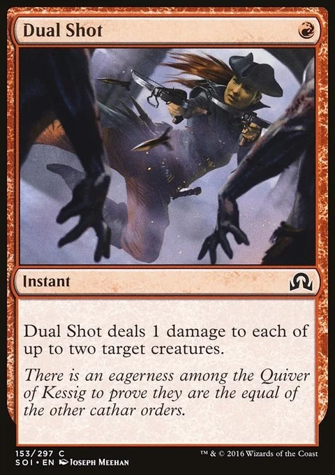 Dual Shot deals 1 damage to each of up to two target creatures.