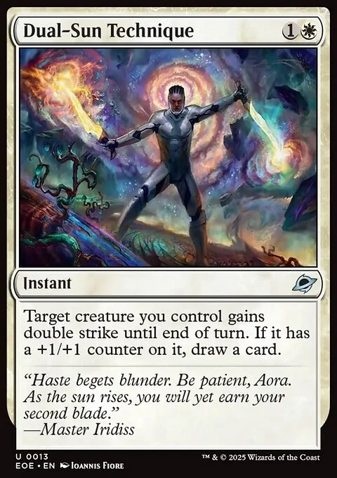 Target creature you control gains double strike until end of turn. If it has a +1/+1 counter on it, draw a card.