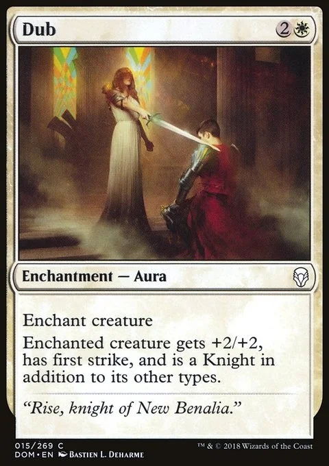 Enchant creature Enchanted creature gets +2/+2, has first strike, and is a Knight in addition to its other types. (It deals combat damage before creatures without first strike.)